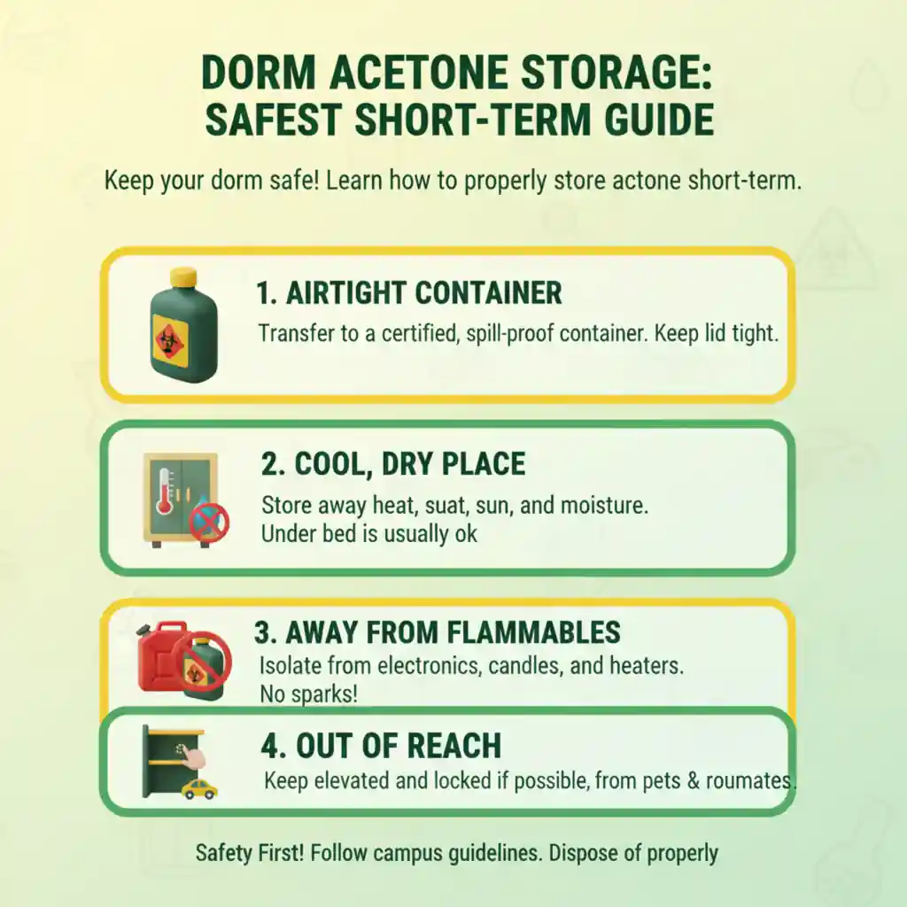 Short-term storage means you’re holding acetone only long enough to dispose of it properly. In a dorm setting, that typically means: