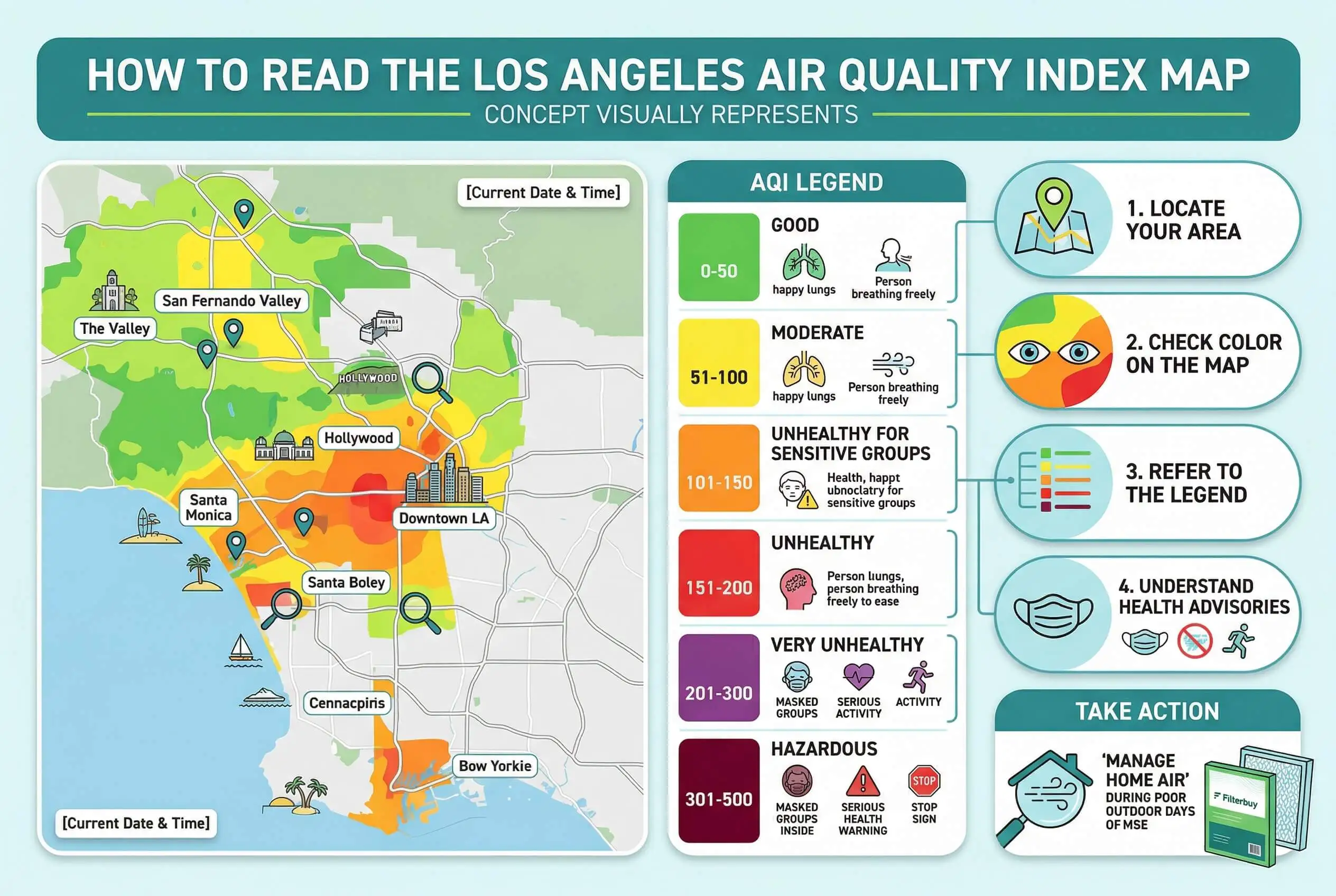 A: The Los Angeles AQI map is a real-time, color-coded display of outdoor air pollution levels across the basin. Here is how it works: