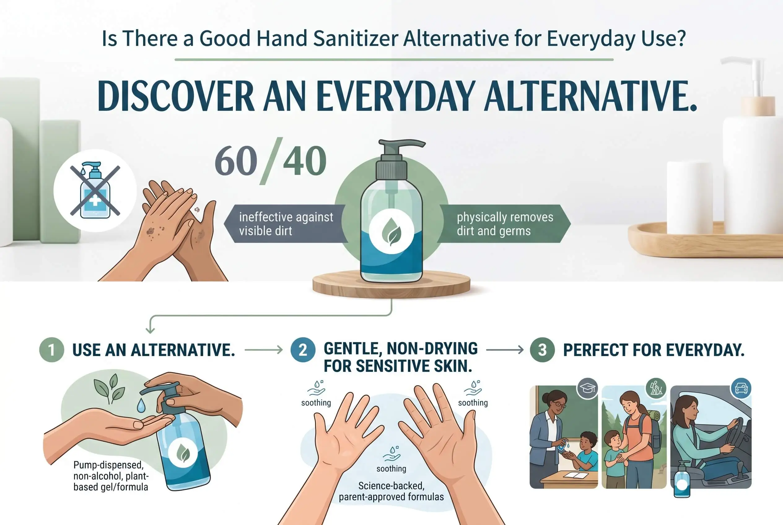 For most everyday situations at home, the best alternative is plain soap and water at a sink. When a sink isn't available, a rinse-free, plant-based soap that physically lifts germs and dirt off the skin is the closest functional substitute and avoids the indoor VOC load of alcohol-based gels.